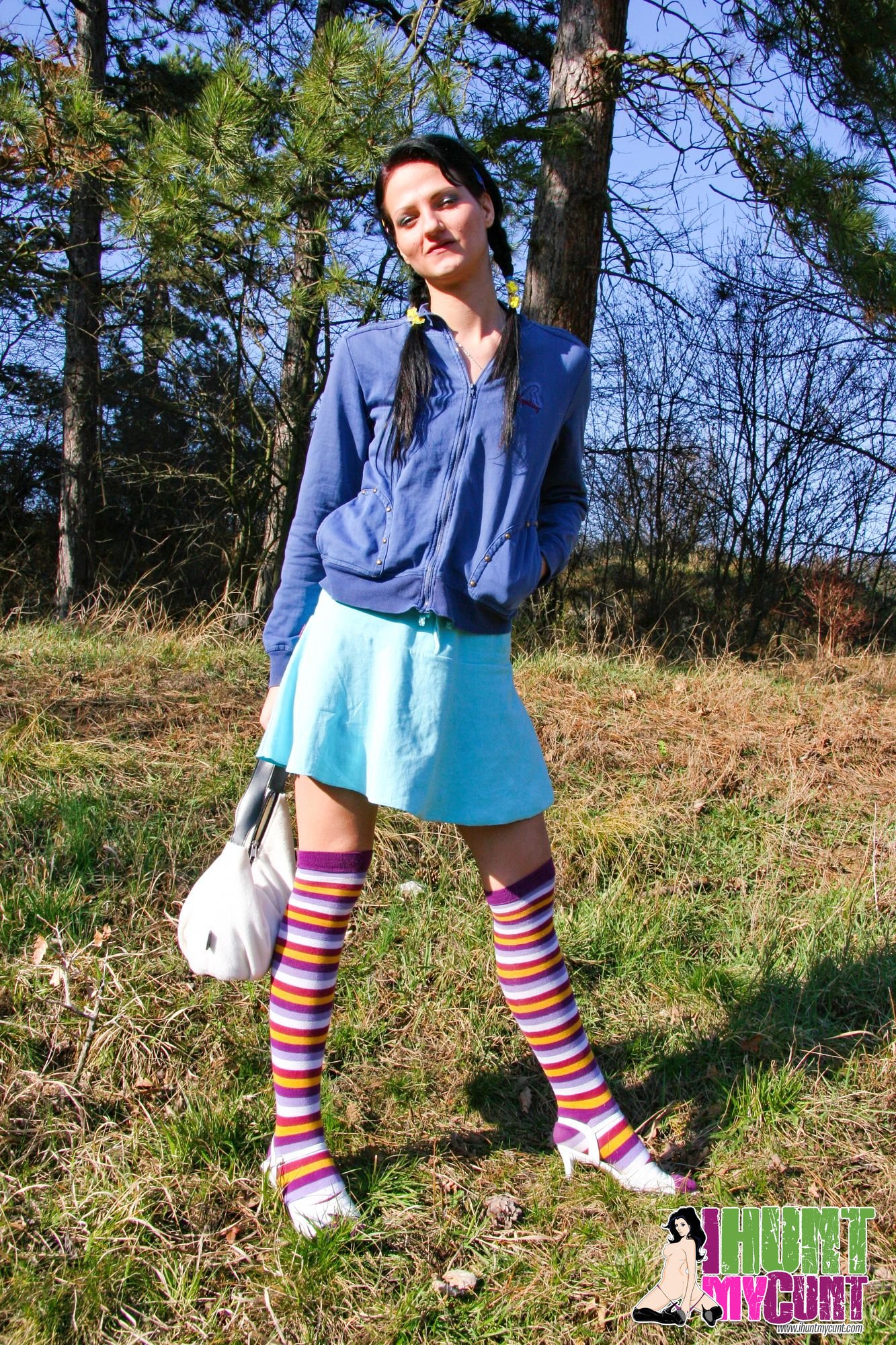 Hot skinny girl Anette Fox goes for a walk in nice hot summer day. As she walks around, she gets horny. She can't stand it, she takes off her panties and starts masturbating on near meadow. Watch this perfect skinny girl with cute tits wanking her pussy outdoors here on IHuntMyCunt.com. Now in HD!